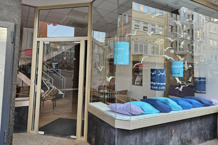 Die Schaufenster unseres Ladenlokals und den Schriftzug des Hauses gestaltete die Künstlerin Birgitta Schwansee. Sie hat Wortpaare in verschiedenen Sprachen gestaltet, die Themen unserer Arbeit aufgreifen. Die farbliche Gestaltung greift die Farben der Stiftung Hundertfach auf. Die Künstlerin hat uns einen Text zu ihrer Fenstergestaltung geschrieben, den Sie hier lesen können.